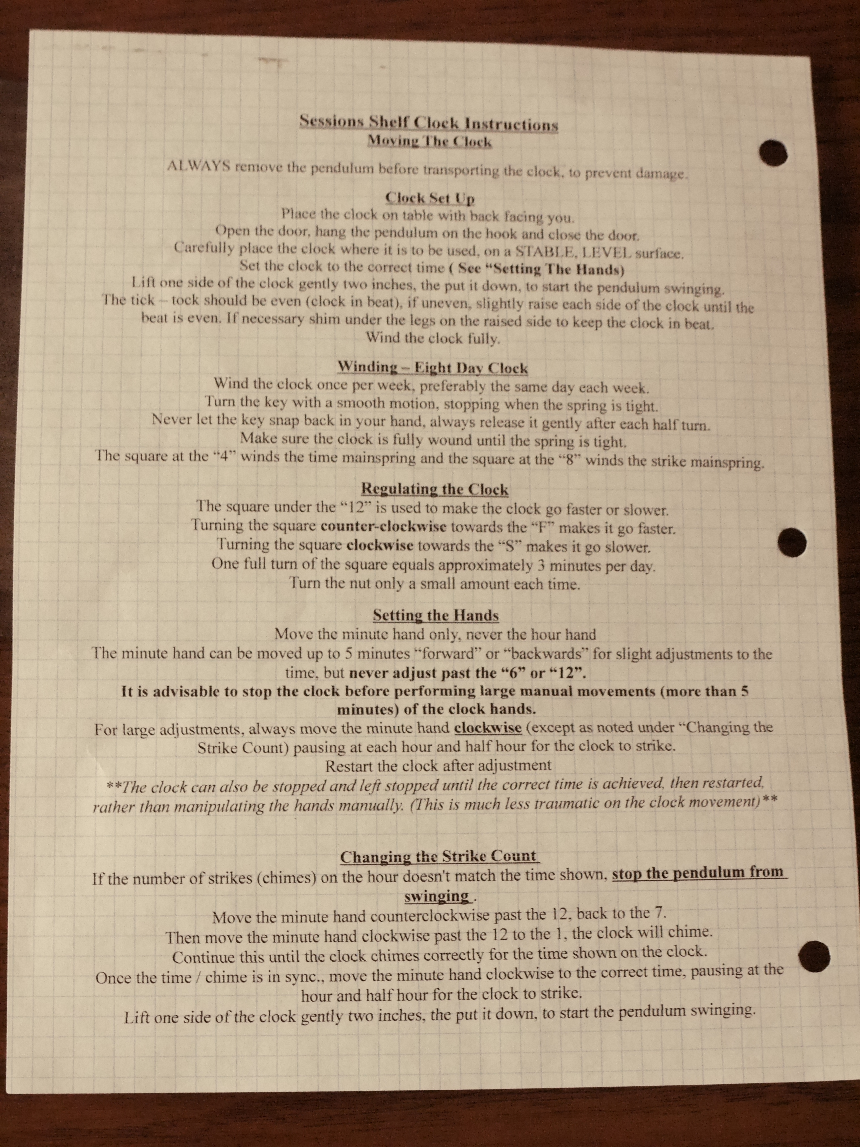 I acquired my Sessions Raven clock about a year ago. It had been serviced by someone knowledgeable about clocks and arrived in excellent condition. The movement had clearly been disassembled, oiled, tested, and the case carefully reconditioned. Interestingly, it also came with a set of instructions from the person who had worked on it.