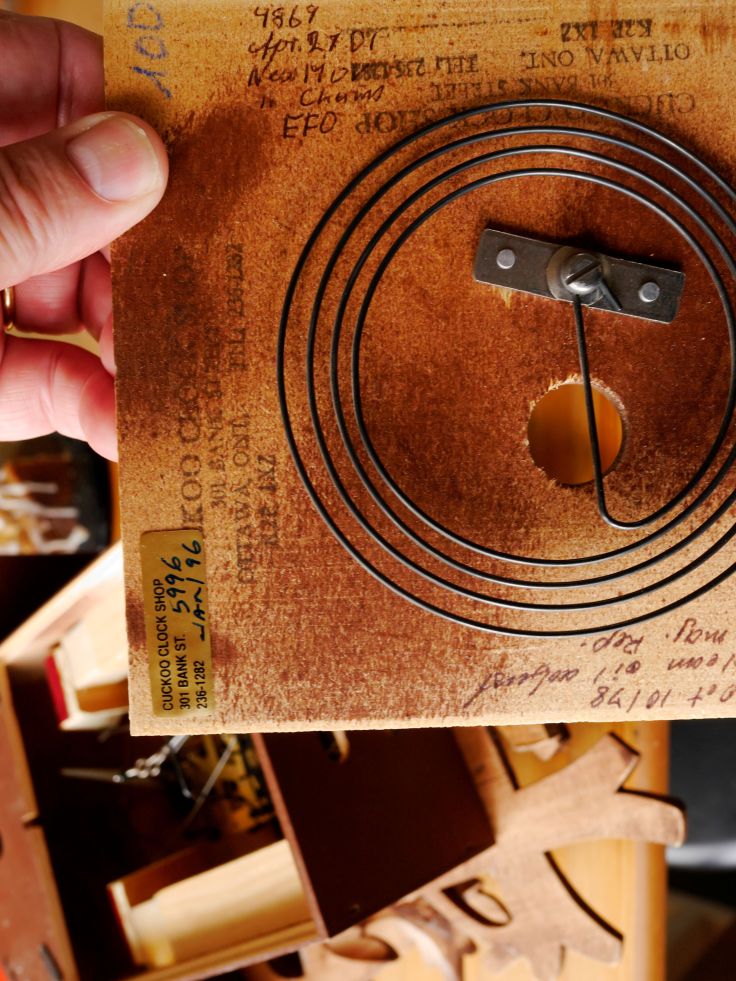 From the service records, I observed that the clock is on its third movement. It is often simpler (and cheaper) to replace the movement in a cuckoo clock rather than to repair it. Attempting to repair a cuckoo clock is very time consuming, frustrating, and costly. In addition, if the entire clock had to be shipped, the case usually incurs extensive damage as it makes its travels. This is the reason most clockmakers no longer accept most cuckoo clocks for repair.