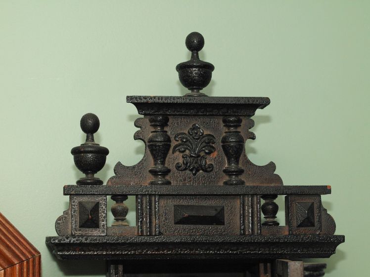 - Crosspiece for top of door fashioned from kitchen cabinet moulding, stained to match case, shellacked (later removed)