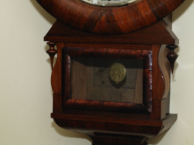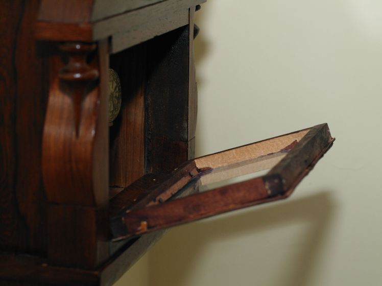 I assembled all the pieces I had from the barn find. Missing were small trim pieces, the pendulum bob and leader, the clock hands and verge. But two key pieces are required, the brass dial bezel and the drop door. During the course of making inquiries concerning the missing pieces, the movement was serviced and installed in the case. It is running reliably and maintains a full 8-day cycle.