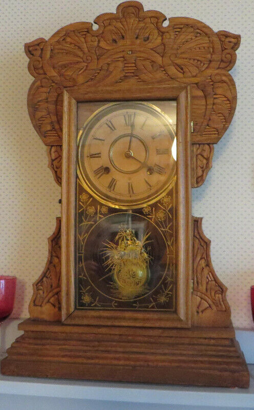 “Pine”, “1900” and “antique” might be correct but what style is this clock? It is not a Grandmother clock but commonly known as a kitchen clock or a Gingerbread clock. It is not carved but steam pressed and tens of thousands of these were made.