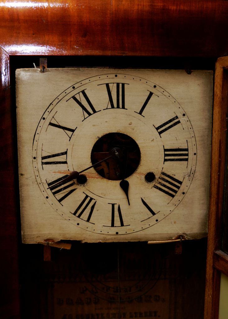 The clock has a brass time and strike, weight driven movement with an excellent original printed paper label on the interior reading in part “Made and Sold at/46 Courtlandt St/New York…. George H. Clark”. It measures 28 x 17 x 4.5”. This rectangular shaped case is decorated with nicely grained mahogany veneers. The veneer has very little if any losses.