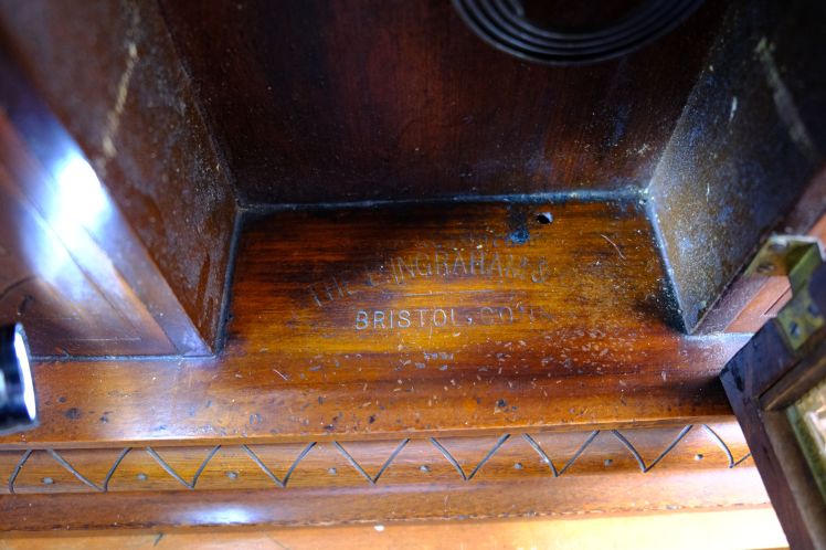 Stamped in the middle of the front plate is “E Ingraham Co patent date Oct 8, 78 Nov 11, 79, Bristol Conn.” On the inside floor, it is stamped “Manufactured by the E Ingraham & Co, Bristol Conn”. It was not a common practice to stamp the inside floor but it is an interesting feature. The slight difference in the name is puzzling and makes it a challenge to accurately date the clock but suffice to say that it was made somewhere during the 10 year period between 1887 and 1897.