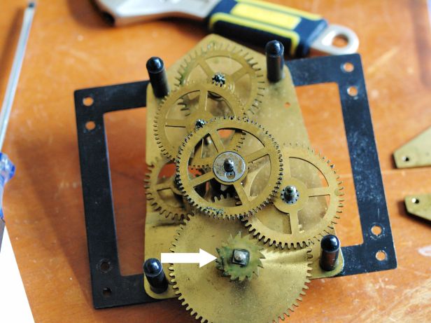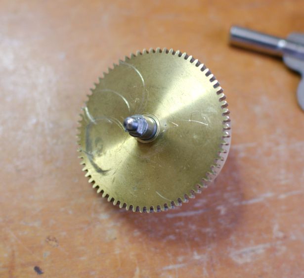 To remove the barrel arbor from the barrel, I first had to take off the ratchet gear. Lacking a gear puller, I placed the barrel in a vice, positioned two pieces of wood on either side beneath the ratchet, and gave the arbour a light tap with the nylon end of a brass hammer. The ratchet came off easily.