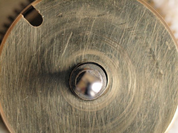This particular movement does not have plated pivots. However, the second issue—soft brass—is evident. In this case, the steel arbor has caused significant wear to the brass cap and barrel.