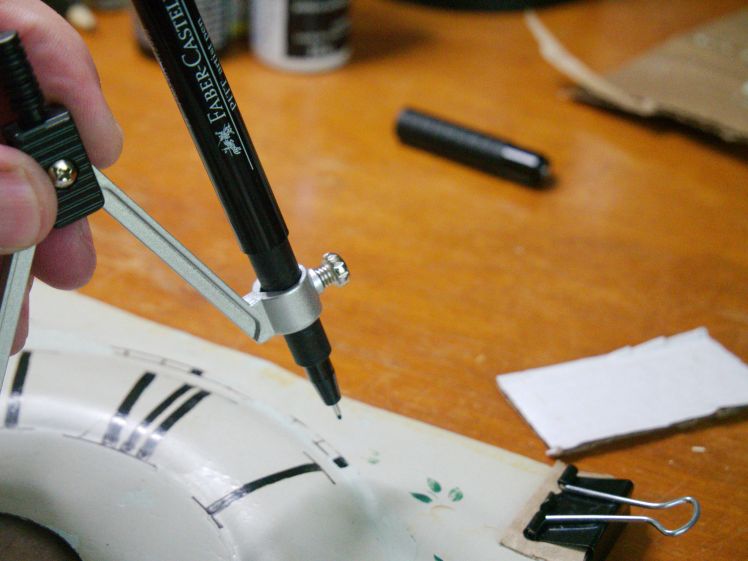Once the inner and outer rings of the time track are completed, press the credit card against the convex time track and using the Sharpie pen draw thin straight accent lines on each of the numerals. The effect is subtle but effective.
