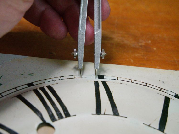 The chapter ring consists of two concentric circles placed close together. Establish exact centre of the dial and scribe the chapter ring or time track using a compass attached to the sharpie pen then scribe the faded radial minute marks on the chapter ring.