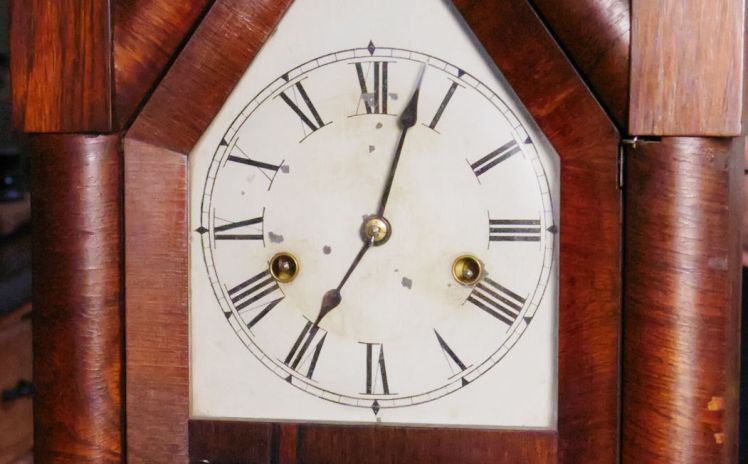 The dial is original and has some loss that would be expected in a 135-year-old clock. The tablet, likely original, features a sailboat against Greek (?) temples surrounded by gold foliage on a black background. The design of the tablet was used in other New Haven clocks of the time. Though intended for European export the clock found its way to Canada.
