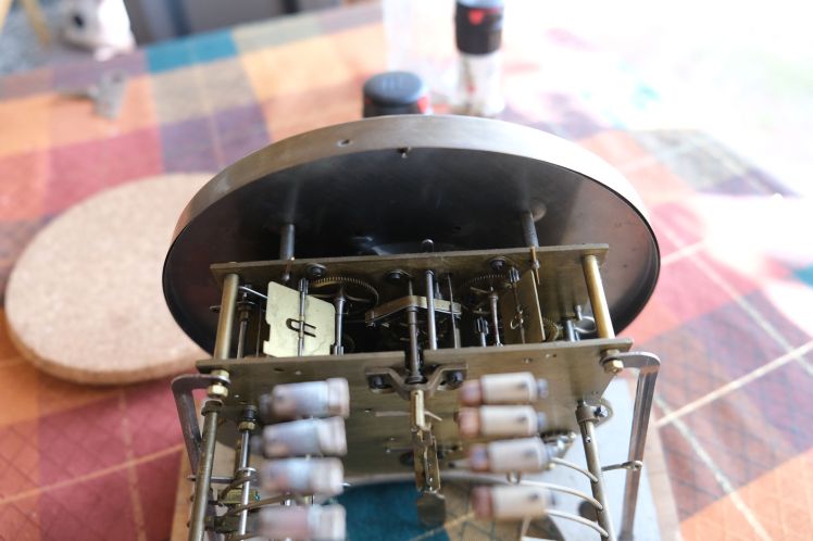 However, the chime medley is off. The first 8 notes of the Westminster chime are at the end of the hour strike sequence (16 notes on the hour). The chime drum will require adjusting. But what a sound! There is nothing quite like the reverberating chime of a Vedette clock.