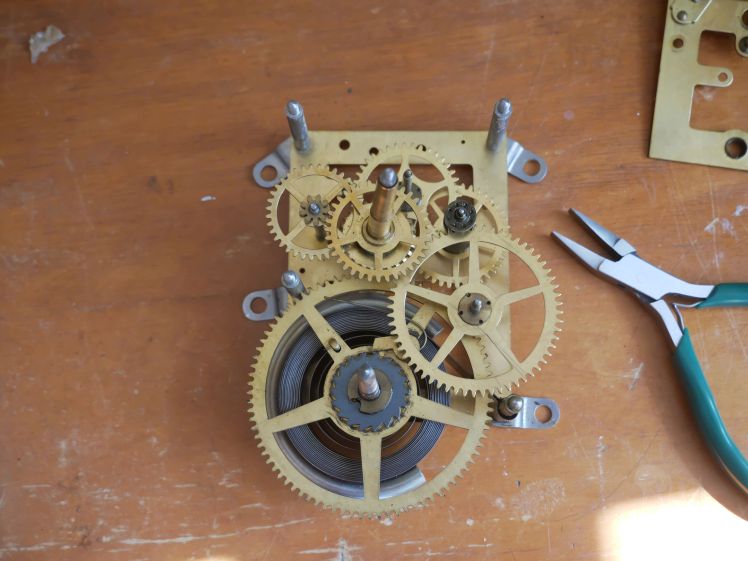 It was a quick fix. I disassembled the movement, put the parts into my ultrasonic cleaner, rinsed and dried them and installed a bushing using my Bergeon bushing machine. I assembled the movement, oiled it and returned it to its case without testing. Time-only movements are the simplest to work on and it is rare that a problem is encountered.