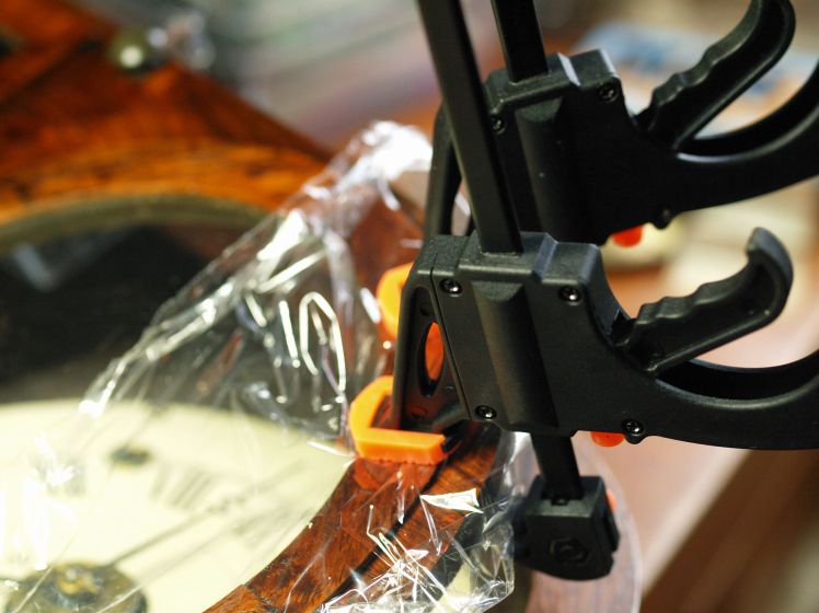 I secured the piece in place using dollar-store clamps. The cellophane ensures that any residual glue does not stick to the clamps.