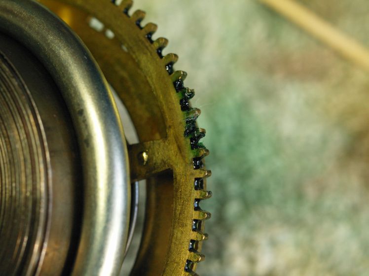 The lantern pinions, T1/T2 teeth, both ratchets and mainsprings also had green gunk and this leads me to suspect that parts of the movement were sprayed with a water dispersant cleaning solvent such as WD-40 more than once during the intervening years.