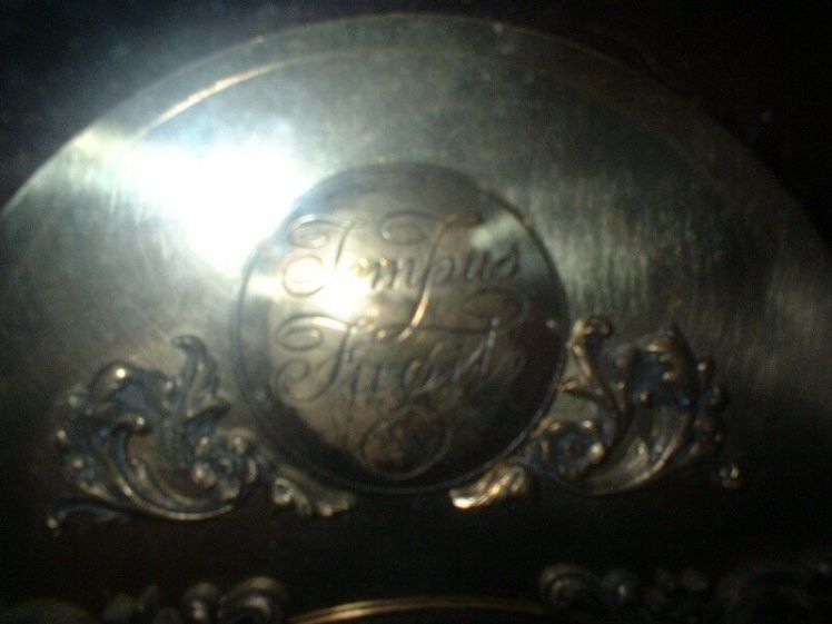 What is most amusing is the description which says “There is a name on it I believe it says JEMLAUS FUOITE. I did try to take a picture of the name.” It actually says Tempus Fugit or Time Flies but I had to laugh.