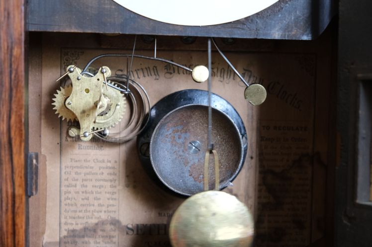A distinctive feature is the sturdy, well designed lyre 8-day “Plymouth” time and strike spring-driven movement on a bell gong with alarm so called because it was made in Plymouth Conn. Plymouth Hollow, Connecticut became the town of Thomaston in 1865. Seth Thomas would have used movements with the Plymouth stamp through to the 1870s and this clock is probably from the 1865-70 period.