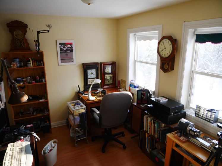 My clock hobby has evolved to the point that I am constantly looking for ways to increase efficiency and adapt space to suit my needs. What began as an upstairs bedroom has become my office/shop for the past 6 years.