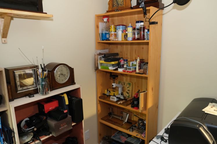 My bookcase is now filled with clock supplies. One of these days I will inventory what I have and move some of the stuff I seldom use to my basement shop. Of course, I could continue selling off some of my clocks to make more space.