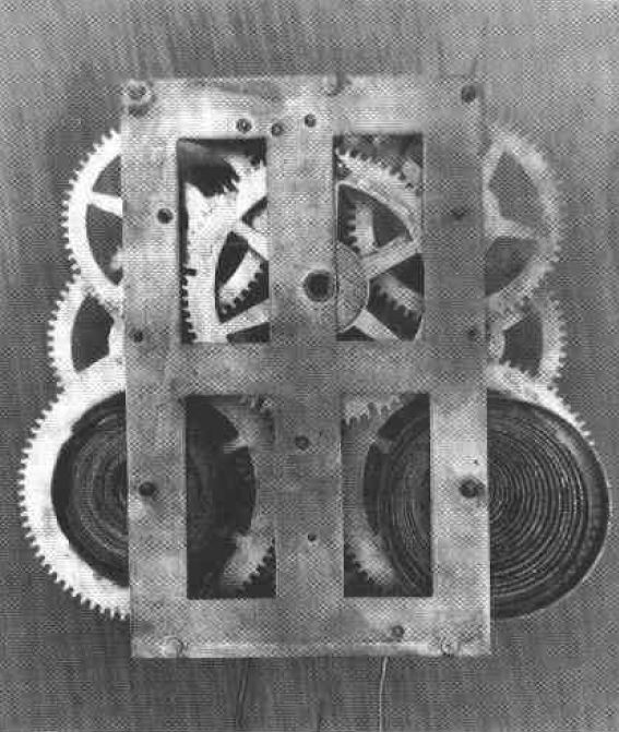 Many American time and strike movements have the count wheel located on the left side of the front plate just above the mainspring (or winding arbour for a weight-driven clock). Placing the count wheel in the rear of this movement adds complexity to the lever arrangement. Also absent is a strike-side cam wheel typically found on later American time and strike movements.