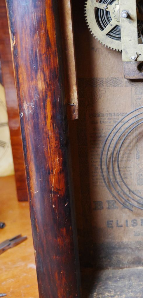 Dating a clock can be a challenge and often an estimate within a range of dates is the best that can be accomplished. Dating some clocks can be relatively easy as in the case of this Sessions Beveled Number 2 tambour style time and strike. Inside the back access door, it is stamped Sept 1927, the date of manufacture.