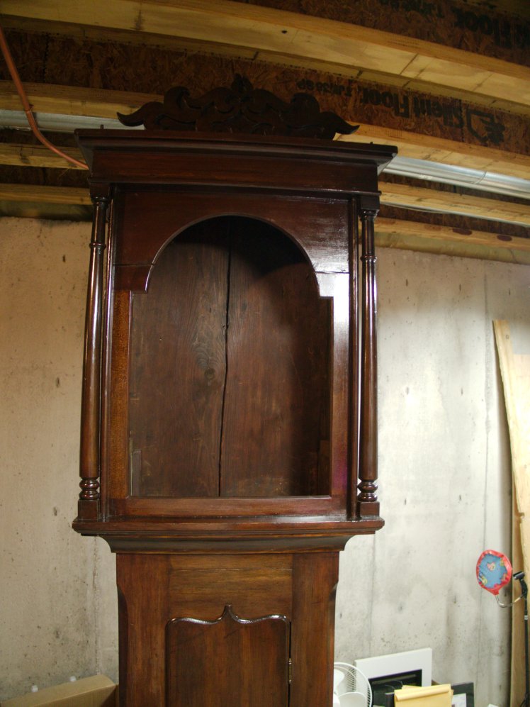 The case has been cleaned, refinished and all structural repairs are complete. Age cracks are best left alone and in my view, they are part of the character of the clock. The new repairs become part of the history of this tall case clock.