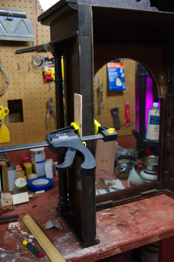 The case was off balance for an obvious reason. It was completely missing the right rear foot. I measured the other 3 feet for height and cut a softwood block to fit, then glued and clamped it in place.