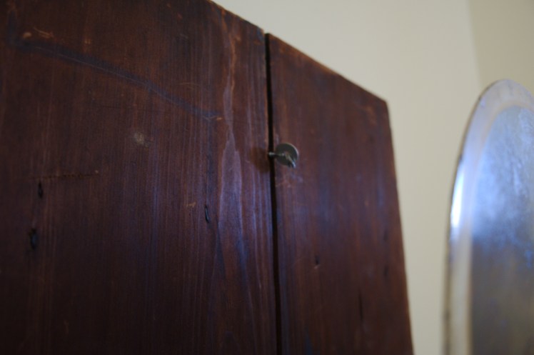 Both upper and lower door pins were missing. I considered what I would use as pins. Wood screws could work.