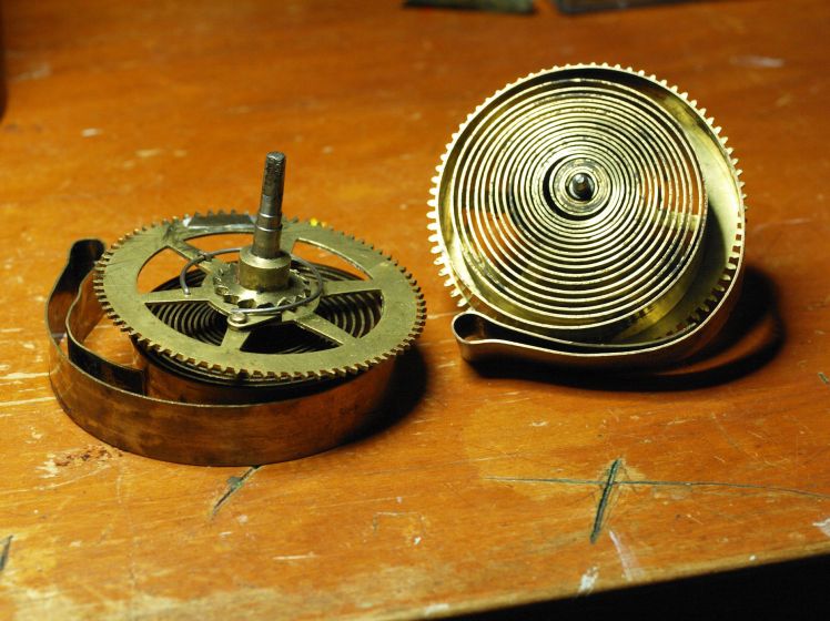 Brass mainsprings are very rare. It is possible for a clockmaker to go through their entire career without seeing brass mainsprings. Why? Because brass was used for a very short period as a mainspring in clocks. From 1836 to 1850 brass mainsprings were used because steel was considered very expensive. It was not until 1847 that the tempered steel mainspring developed for everyday clocks was introduced and with it, the brass mainspring faded into clock history.