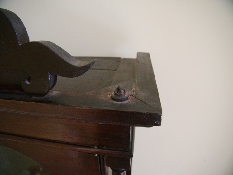 The final step in the repair/restoration of my tall case clock are the top finials. This clock had top corner finials at one point in its life. There is evidence that something was there on either side of the crown. I have no idea what they might have looked like but judging from photos of many tall case clocks of the 1850s period they were likely a brass ball type.