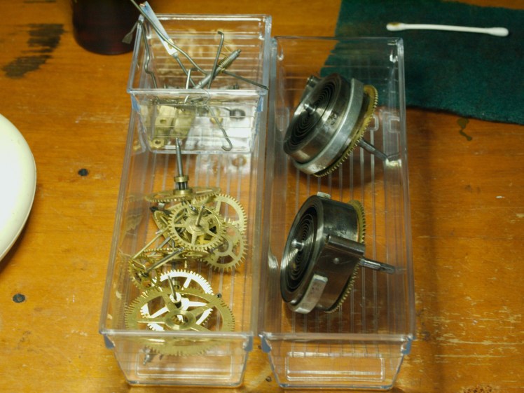 I usually put the time and strike gears and pretty much everything else in one or two containers. When you have done many movements you learn to quickly identify the location of each component. I can take out any wheel or lever, for example, and identify its specific location. However, if you are just starting out or have not built up enough confidence I highly recommend separating the two sides. In the early days of clock servicing, that is exactly what I did.
