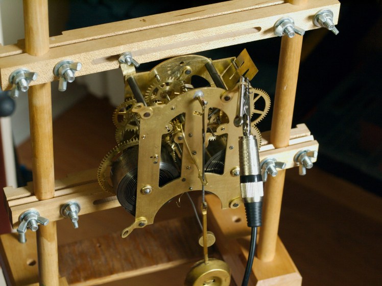 On the first attempt, I was not able to synch the strike side locking wheel (sometimes you get lucky the first time) but I mounted the movement on the test stand overnight to check out the time side and the next day it was running as expected. The locking wheel pin needs to be adjusted but that can wait till tomorrow.