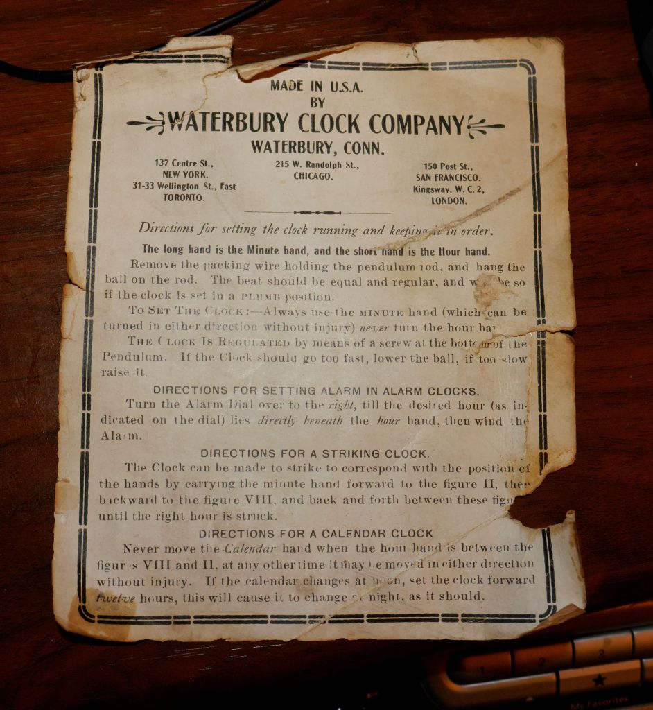 It is a solid oak case measuring 19 inches long by 12 inches wide, with an 8 inch paper dial marked Waterbury, a black and gold pendulum aperture, and 8-day time-only movement. The bottom of the dial says, ” Made in the USA by Waterbury Clock Company”, Connecticut. These clocks are often refereed to as schoolhouse clocks though I can’t imagine the dial of a clock this small visible from the other end of a classroom.