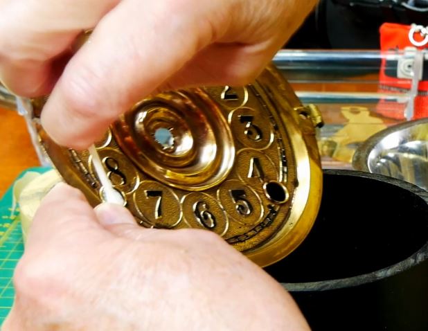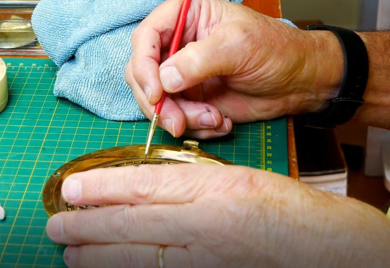 Hand painting is an art and a steady hand means the difference between a homemade job and one close to the original factory application. I used a multi surface water-based acrylic satin black paint, one I often use for clock dials, hands and so on.