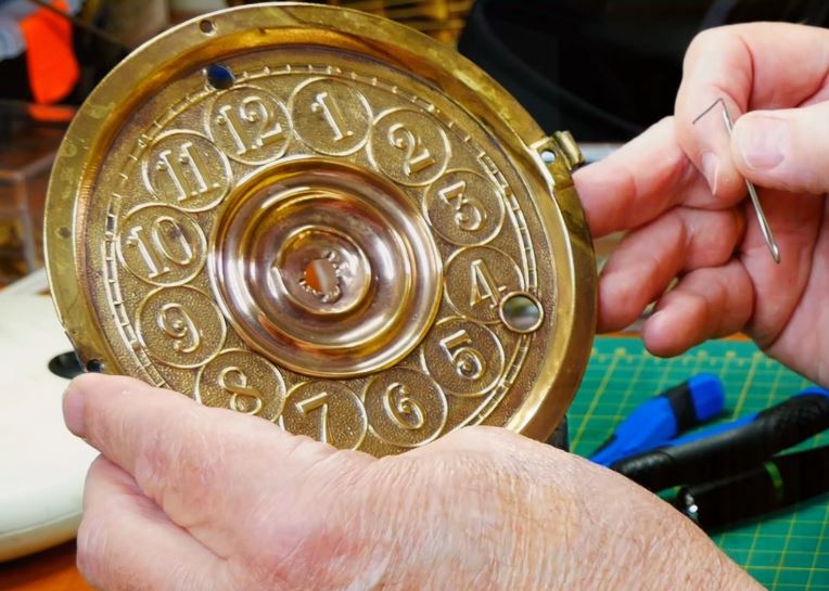 Should the dial be left as-is or retouched? It is an age-old clockmaker’s dilemma. We all have our views but I tend to take the position that if it is grimy and unsightly and takes away from the look of the clock it should be cleaned and retouched.