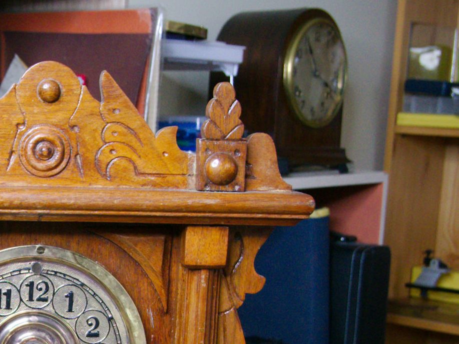 I originally assumed this clock was a Seth Thomas since it had a Seth Thomas movement. After a thorough search on the web, I concluded that this was not a Seth Thomas case. I searched for clocks made by other clockmakers, starting with E.N Welch, Ansonia (because it is similar in style to the Syria), Gilbert, Sessions and finally Waterbury. The term “Waterbury cabinet clock” generated some hits. I found one on an auction site then, two more. I now have a case made by a different maker than the movement and in clock circles this is called a marriage.