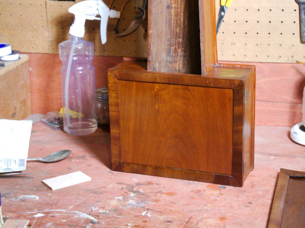 Shavings from old veneer are glued into screw holes for the mounting ears and the case hook to ensure that those screws are secure.