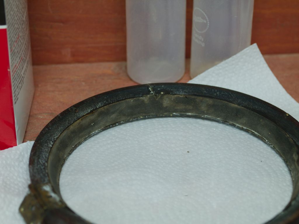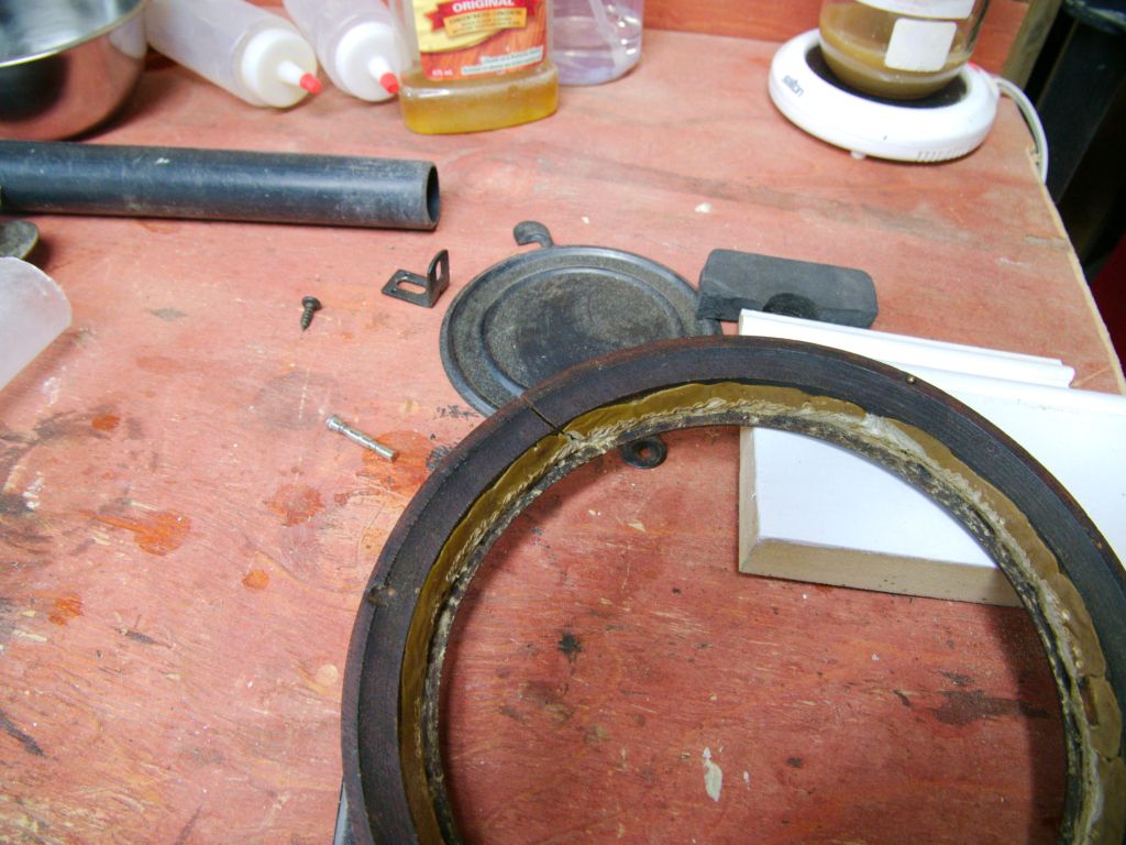 Removing the old putty was a little more involved than I had planned. A heat gun would have been too much and I did not want to ruin the wood bezel but a 30W soldering iron was perfect for this job. I picked away and removed just enough putty to install the glass. I ordered 6 13/16 inch flat glass and it was a perfect fit. Wet putty is always an option but Plaster of Paris is easier to work with, does an equally fine job and secures the glass in place.