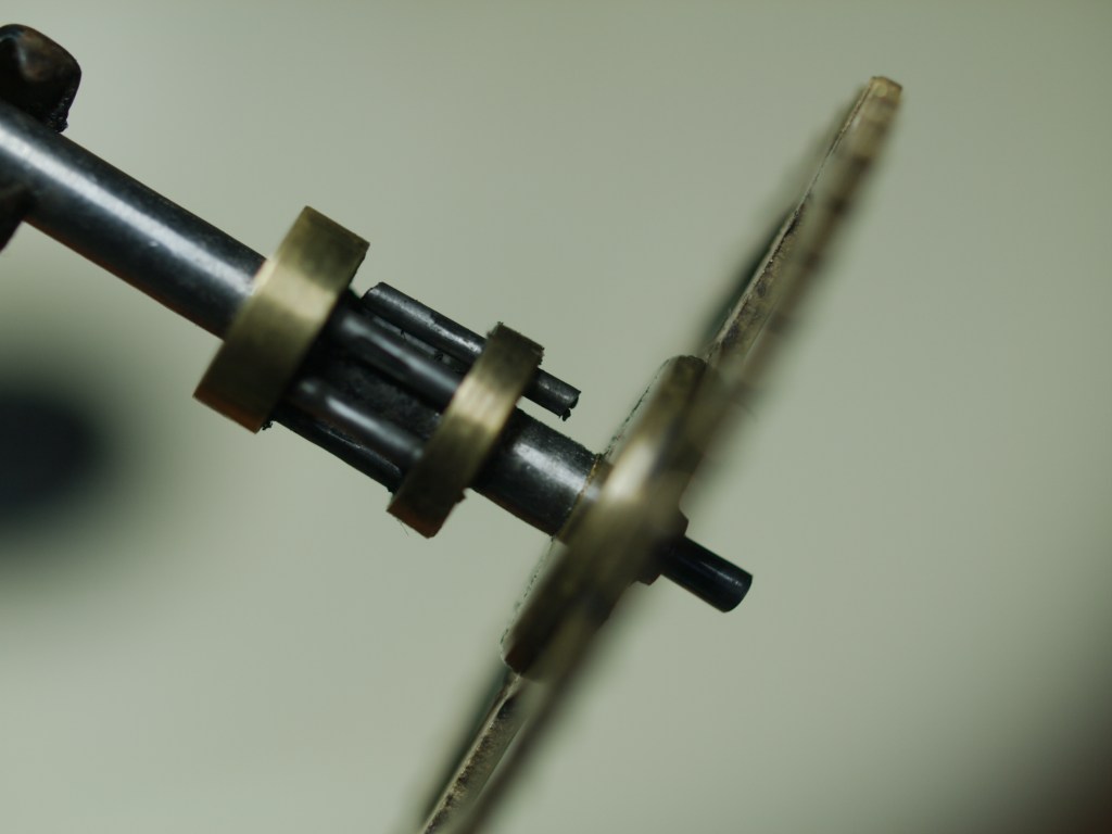 The lantern pinions have some wear but are quite acceptable. One trundle is loose on the escape wheel. Rather than take it apart and re-seat the troublesome trundle, a dab of Loctite Red should fix it in place.