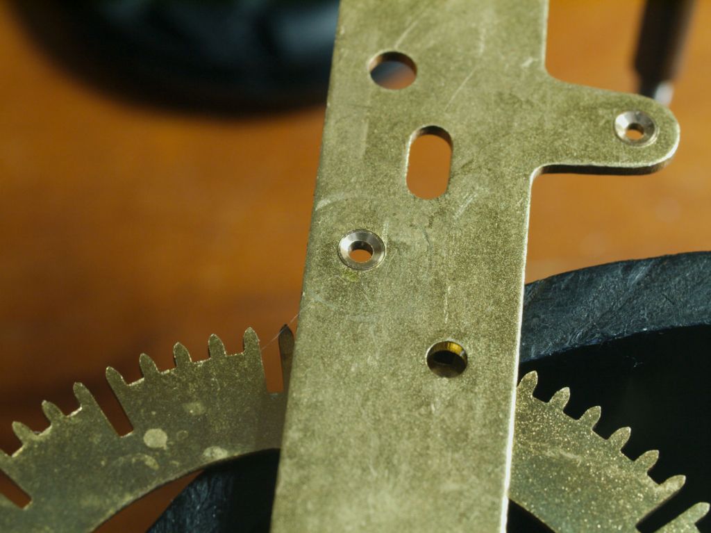 The click and rivet design are a special problem on Sessions clocks, and I am happy to see that both clicks are in good condition after 5 years. It might be unfair to criticize parts that are nearly 100 years old. The photo shows what a worn click would look like.