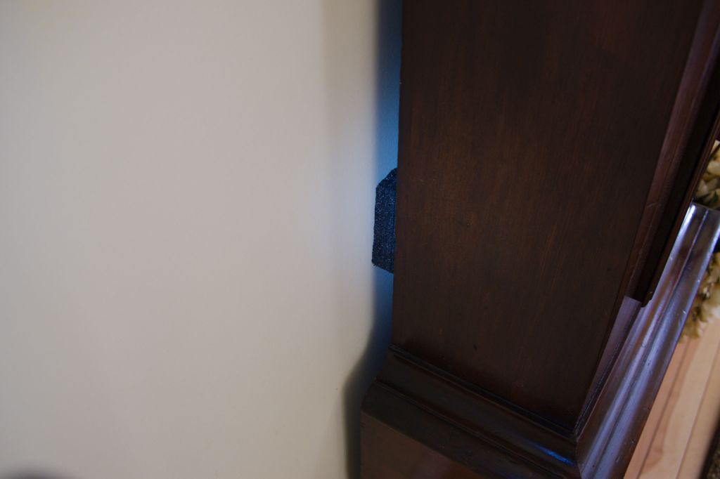 The solution came in the form of protective packaging from an Amazon delivery—dense black foam blocks placed behind each side of the clock case, at the same height as the pendulum. Occasionally, I have to reposition the blocks, as the vibrating action of the strike causes them to slowly fall over time.
