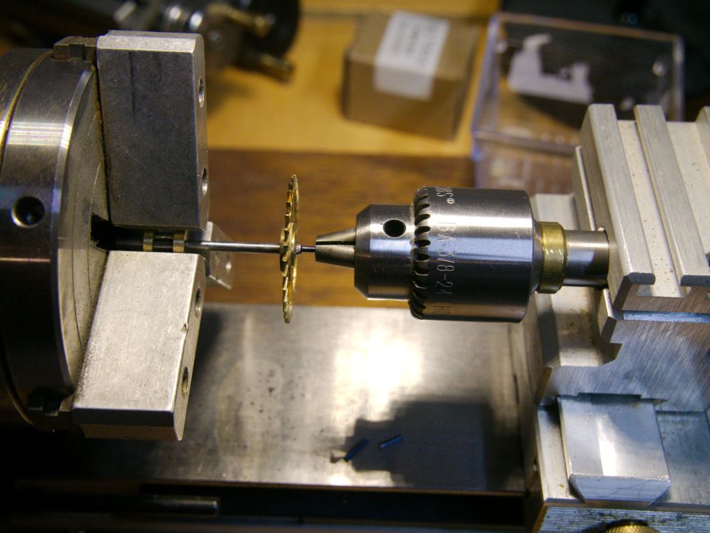 Using a mini lathe I began with a centering bit and then with high-speed bits drilled holes in both ends of the escape wheel to a sufficient depth to anchor the pivot wire. I have a good supply of pivot wire and it was a matter of selecting the correct size, which in this case is 1.35mm wire.