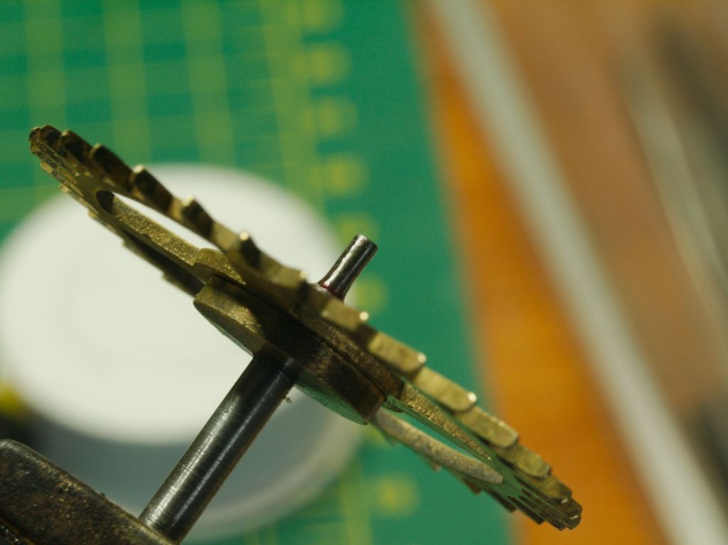 A sizable portion of the brass was chewed away on the escape wheel bushing, backplate. As wear accelerates over time, the clock would eventually “grind” to a halt.