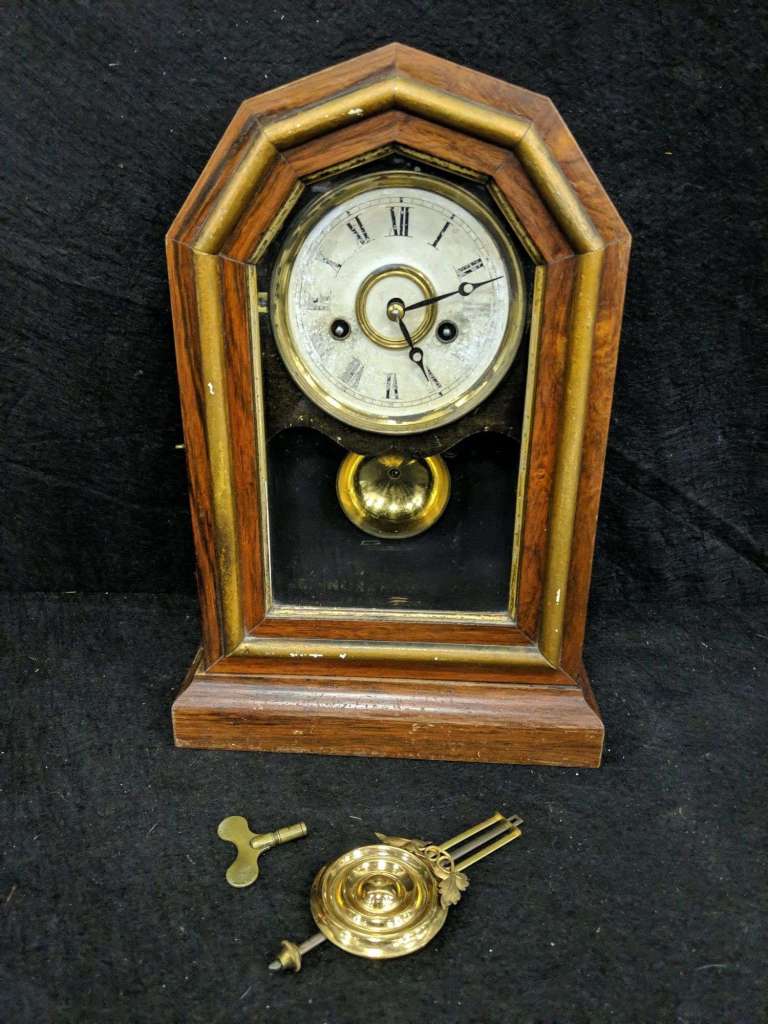 This 30-hour shelf clock (hour strike) was manufactured by American clock-maker E. Ingraham and Co. in the 1870s. There are various iterations of the name over the maker’s history but this was the one the company used from 1861 to 1880.