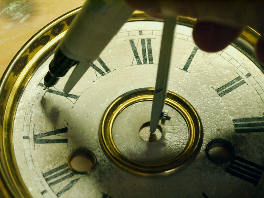 The clock has been transformed. The dial has been rejuvenated, the movement serviced and reinstalled, the bell gong attached, the case given its many touch-ups, and the decorative pendulum is attached. Now to regulate the clock.