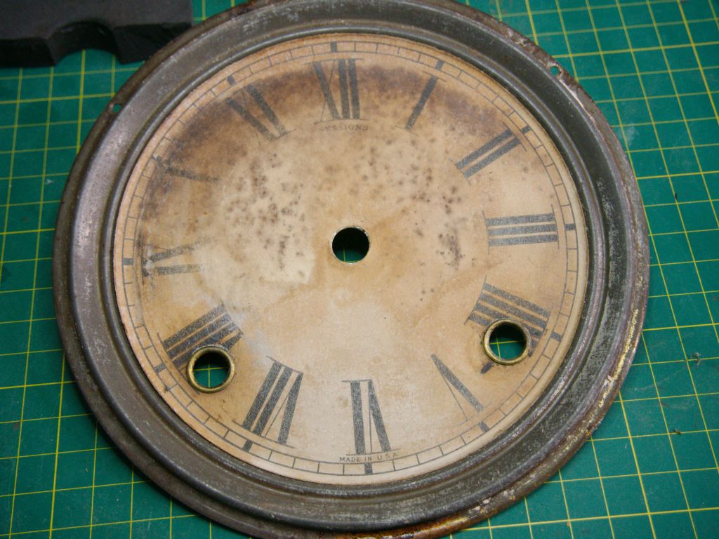 The dial, however, may not be salvageable. One option is a new paper dial, and another is a replacement with a suitable and period-correct alternative. I have the same size Arabic dial from an Ingraham gingerbread that I might use. Manufacturers interchanged Roman Numerals and Arabic dials on some models and I have seen at least one Grand Assortment on the internet with an Arabic dial so, an Arabic dial may be a good look.