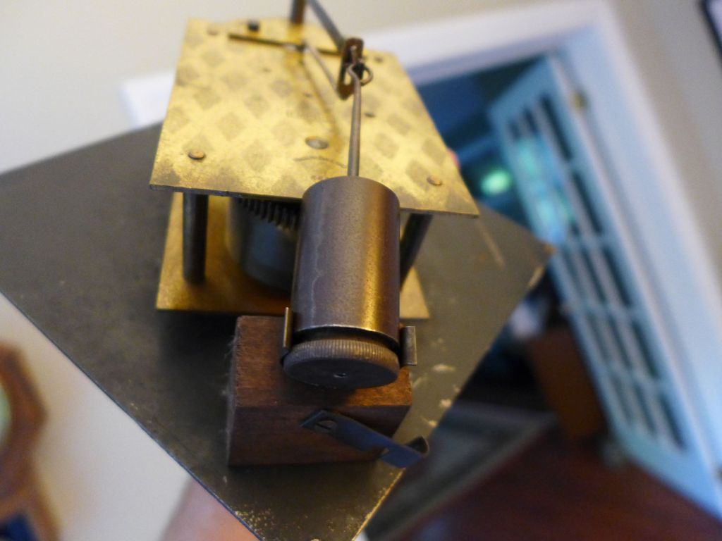 An curious feature is a cylindrical pendulum with a large rotating adjustment screw on the bottom. The pendulum clips into a two piece caddy system for easy transport.