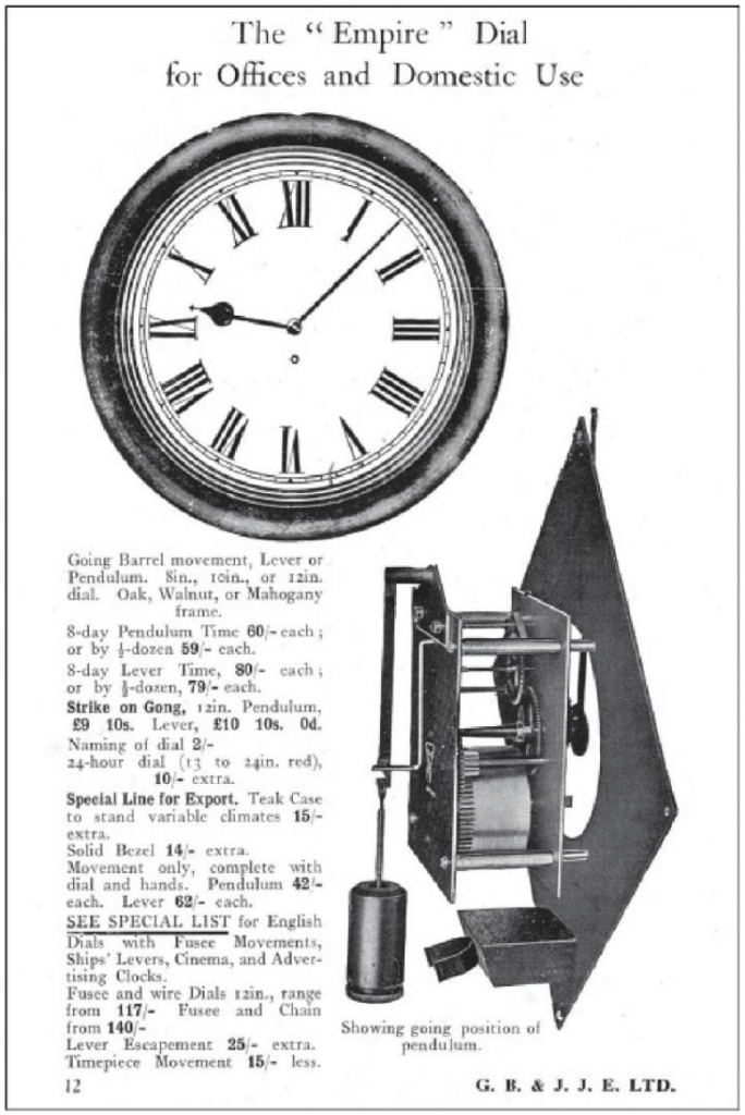 This catalogue image below describes the clock in various configurations. “GB” refers to Grimshaw & Baxter, J.J.E Ltd, is a mystery to me, a distributor perhaps.