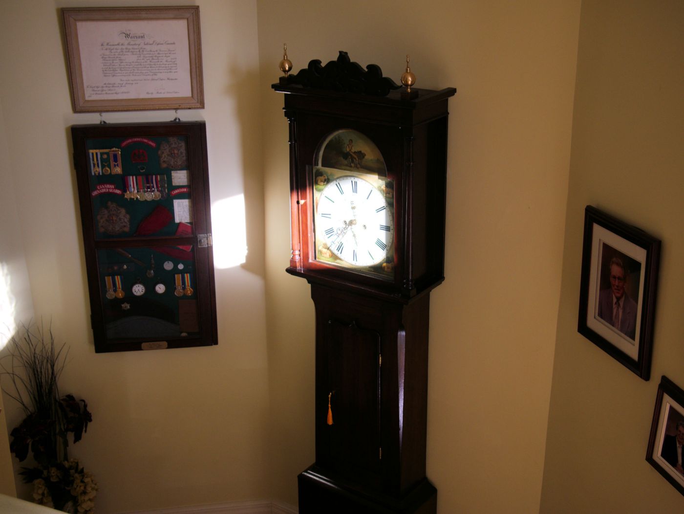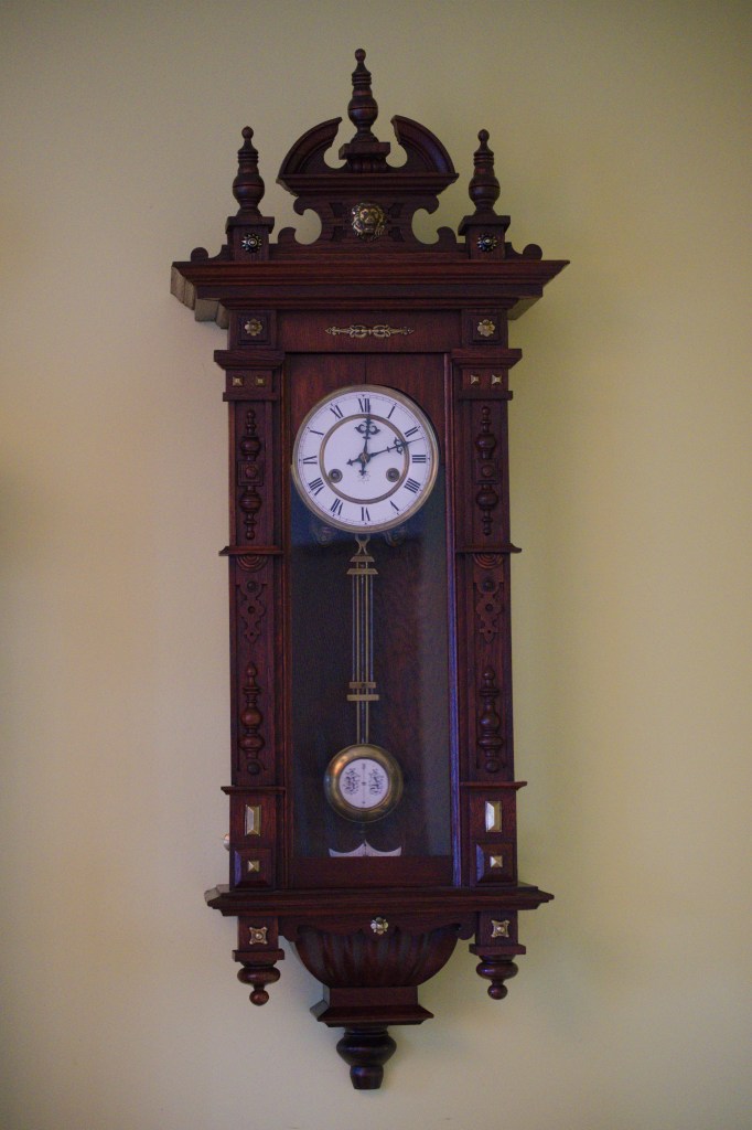 I may consider clocks that have a refinished case if the standard of refinishing is high. I am almost never opposed to cleaning a clock of grime and dirt and applying a coat of traditional shellac (if needed) if that was the original finish or remediating minor veneer issues. A missing finial can always be replaced with a suitable alternative, clock hands can be replaced and some clock movement parts that have worn out can be purchased from a variety of sources.