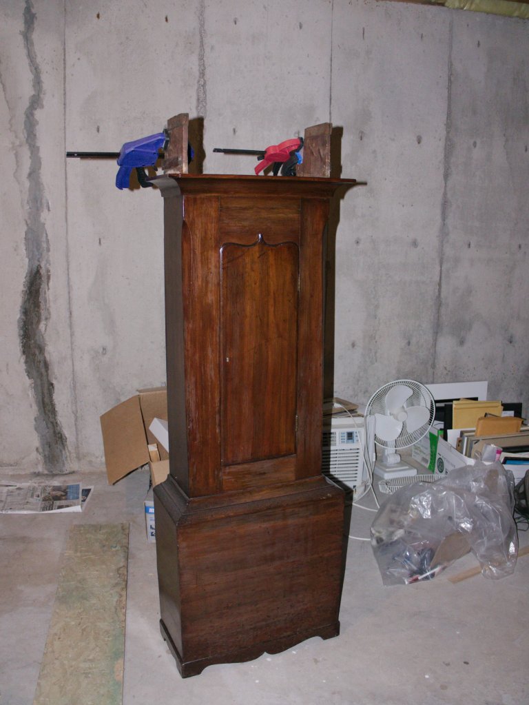 There were issues with the case but the main problem was a detached backboard. The broken backboard (held on by crudely applied modern finishing nails) certainly made it easier to transport the clock in my station wagon because it fell off when I attempted to move the clock. I knew that it had to be repaired otherwise the bonnet would not be stable.
