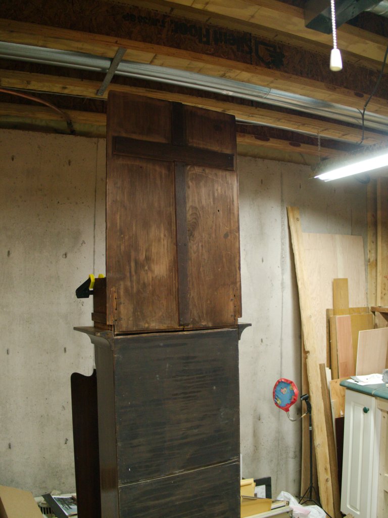 I first had to strengthen the side mounts with high-strength hide glue and slotted screws salvaged for an old clock case. It was not enough to screw the backboard which was in two sections into the side rails so, I fashioned a cross brace of salvaged pieces from an old 140-year-old ogee clock.