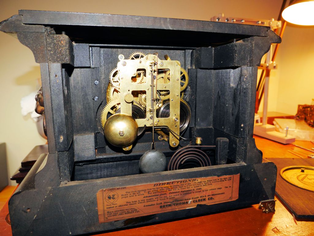 The clock is an 8-day Seth Thomas time and strike. It is in an ebony case with adamantine features. These clocks are known to collectors as “Black Mantel Clocks”, and were popular from 1880 to 1931. The date on this clock is 1907.