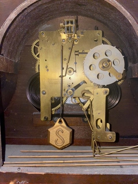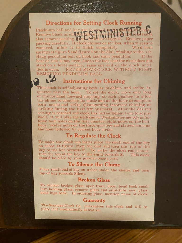 I recently bought a house and the previous owners left this clock behind. It ticks and chimes and seems to be in working order. I’m wondering if you could tell me more about it like what time period it is from and if it is of any value.